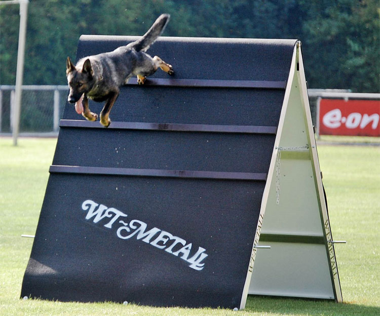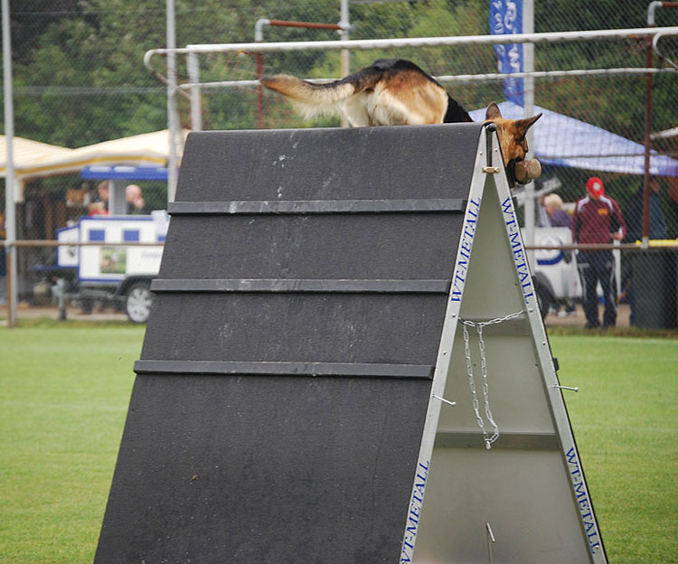 Schuine wand van weerbestendig materiaal met stevig aluminium ladderframe, rubberen bekleding en massieve stootborden.